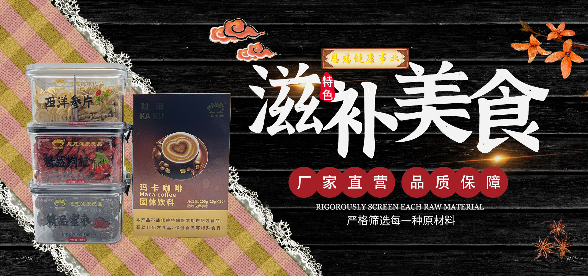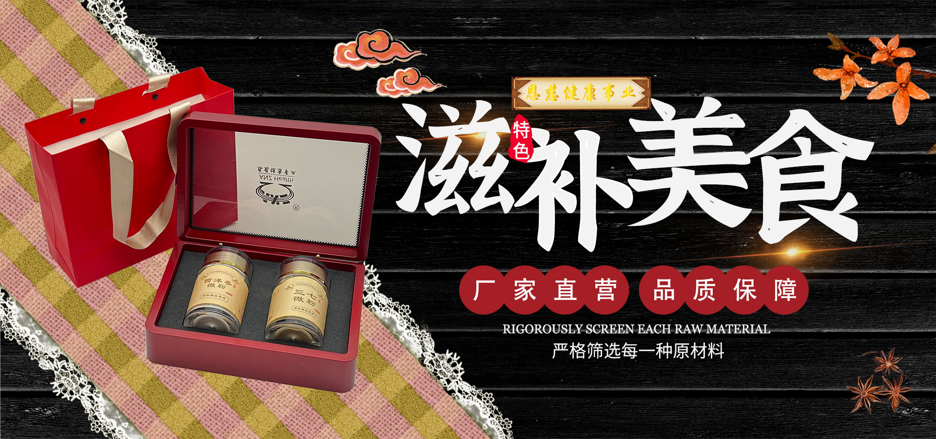 海马系列 醇享精品礼盒至尊精品礼盒海马干品礼盒海马干品对盒,海马干品 固体饮料系列 玛卡咖啡姜黄咖啡荷桑通黑五力参燕粉 代用茶系列 瓶装精品枸杞瓶装精品蜜枣瓶装西洋参片瓶装红参片 滋补养生系列 黄金双拼1黄金双拼2黄金双拼3滋补精品1滋补精品2滋补精品3滋补四拼礼盒滋补五拼礼盒 茶叶礼盒系列 福鼎白茶野生红茶 产品 - 代用茶系列 恩慈健康枸杞礼盒滋补五拼礼盒送父母长辈领导过节礼品年货红参五拼礼盒 精品枸杞礼盒 ¥49.90 恩慈健康红参礼盒滋补五拼礼盒送父母长辈领导过节礼品年货红参五拼礼盒 红参麦冬滋补礼盒 ¥150.00 恩慈健康西洋参礼盒滋补五拼礼盒送父母长辈领导过节礼品年货红参五拼礼盒 西洋参麦冬滋补礼盒 ¥150.00 恩慈健康蜜枣礼盒滋补五拼礼盒送父母长辈领导过节礼品年货红参五拼礼盒 精品蜜枣礼盒 ¥25.00